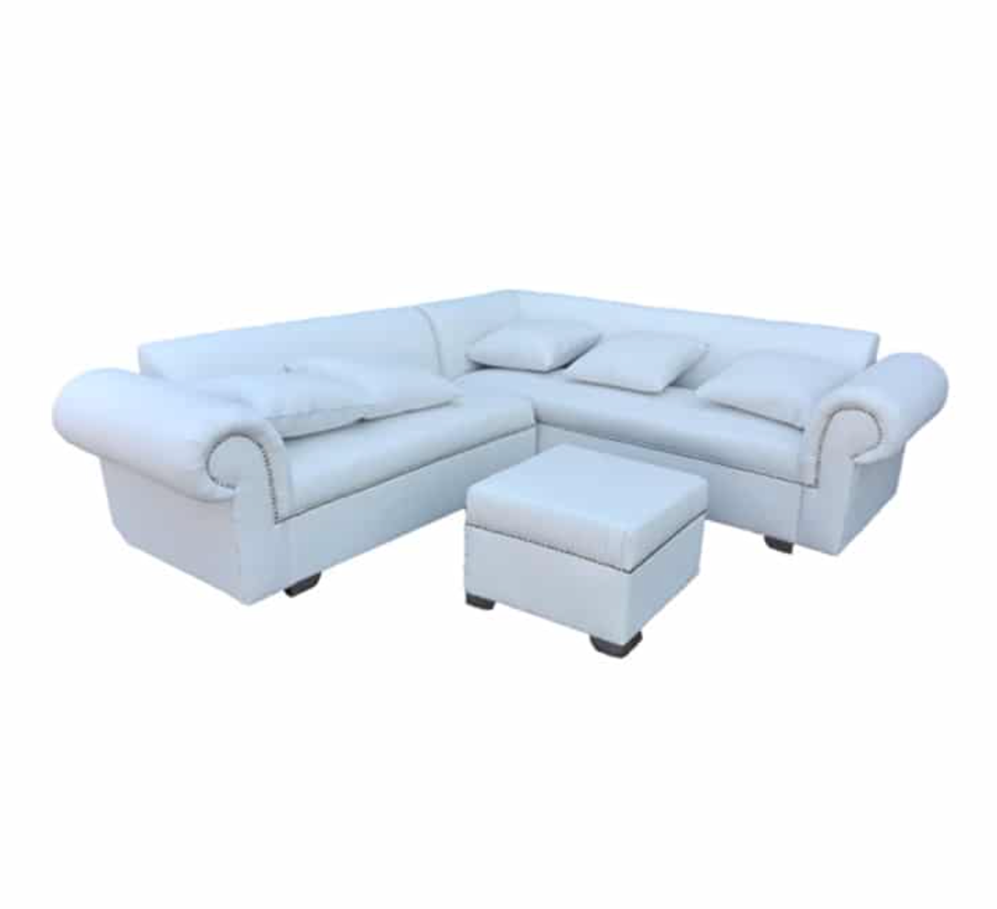 Luxurious L-shaped corner lounge suite featuring elegant rolled arms and studded detailing
